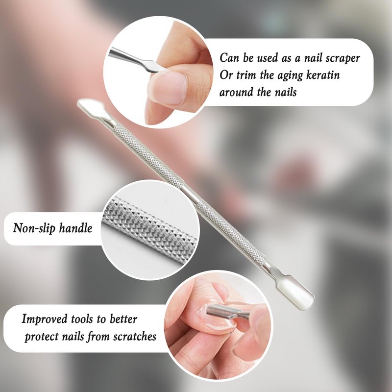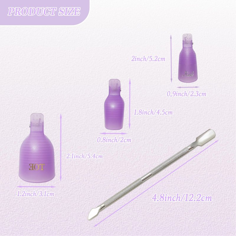 - [Nail Polish Remover Set] Includes 1 double-ended cuticle pusher, 10 reusable finger clips, and 10 toe nail clips, catering to various nail removal needs.