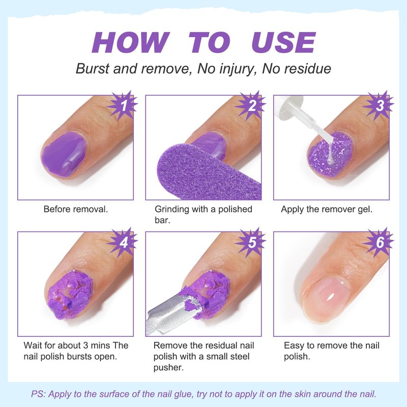 - š§ćEFFICIENT AND TIME-SAVINGćJust lightly smear, and wait for 3-5 minutes, the nail surface will automatically burst, and then remove it gently with a small steel pusher. There is no cumbersome removal process and no long waits, saving you time and money.