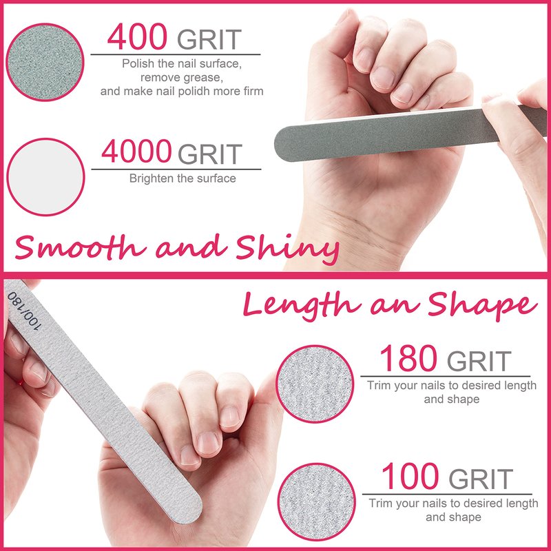 - 【NAIL FILE AND BUFFER BLOCK】Double sided 100/180 grit can help remove nail gel and trim your nail to desired length and shape. 400/4000 buffer block you can use it refine nail surface for smoothing and shining nails surface.