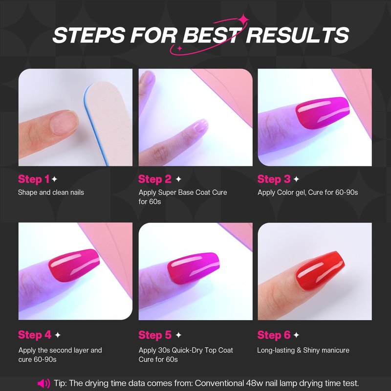 Gel polish base coat: Isolate the natural nail, prevent color glue and natural nail staining, base coat gel nail polish lasting up to 45 days or so. Gel polish top coat: 30s quick-drying, faster than the general sealer lighting time, no wipe top coat gel polish long-lasting and translucent, anti-scratch and wear-resistant, locking the color and fixing the color.