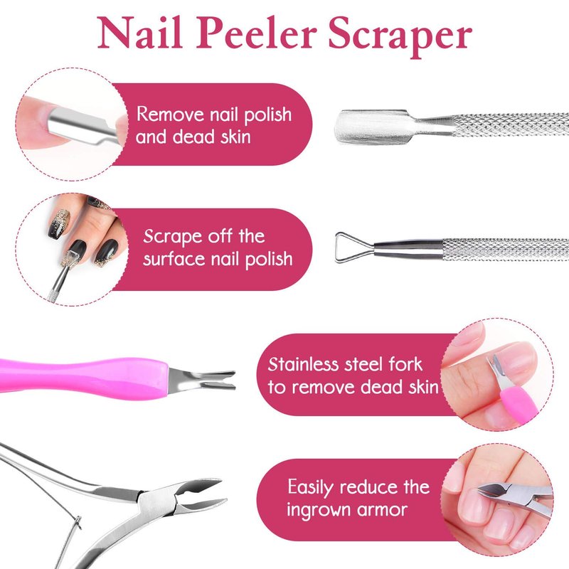 - 【STAINLESS STEEL CUTICLE TOOLS】 Triangle cuticle peeler can get rid of dead cuticle without miss any small gap, help remove soak off nail gel even in your most vulnerable nail edge; Double end cuticle pusher Spoon can be used to push cuticle, clean nail cuticle or dirt, remove leftover skin residue on the nail. The dead skin fork and cuticle trimmer will help you deal with the dead skin easily