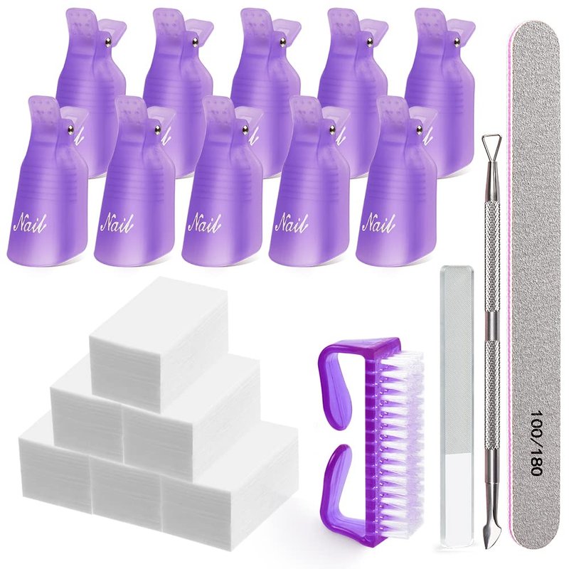 - Your At Home Manicure Solution: Package includes 10pcs purple nail remover clips, 300pcs cotton pads, brush, cuticle pusher and glass nail shiner. One kit meet your need to soak, dissolve, and remove gel. Valuable nail remover kit for salon and home use.