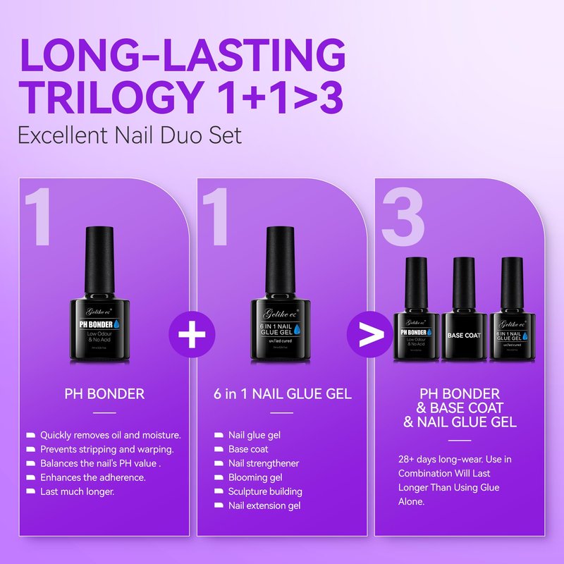 - [STRONG ADHESION] Preparing the nail plate to create a foundation is the most important step in any professional artificial nail application. This set includes nail prep acid-free ph bonder and nail gel glue base gel . Applying this set to have the best foundation for any gel nails like gel nail polish or fasle nail tip!