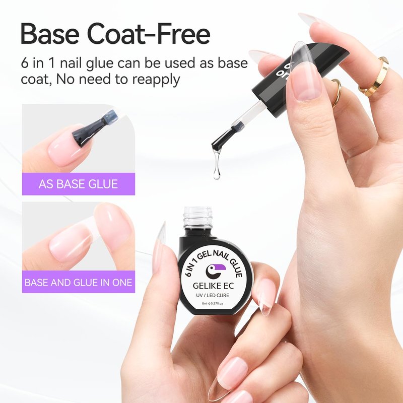 Gelike EC Gel Nail Glue UV - 6 in 1 Gel Glue for Nail Tips,Base Coat Free,2PCS Strong Adhesive for Press on Nails Acrylic Tips