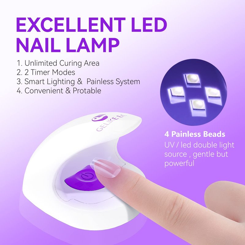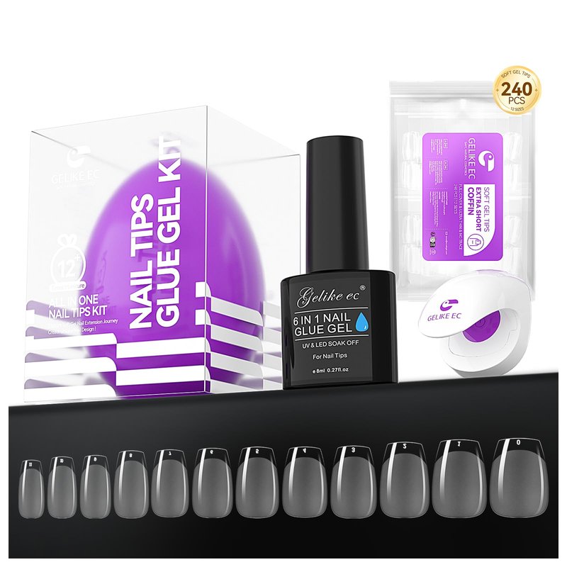 [Gelike EC Unique egg packages with extra gel x nail kit]: Great gift idea for your family or love. With its stylish and elegant specially designed packages, it will be a great way to express your love to someone who is important in your life. As a gift, it is very suitable for Mother's Day, Christmas, Valentine's Day, Easter, Birthday or other great festivals. Perfect for people who are interested in nail art. [Gelike EC Nail Tips]: This complete set of soft gel like tips conforms flawlessly to the nail from cuticle to free edge. With careful use, the effect might last for four weeks. Create a light-cured, preshaped nail augmentation in less than 20 minutes, in conjunction with the curing of the 6-in-1 nail adhesive gel. Our soft gel is created from the most advanced soak-off soft gel substance, as opposed to the typical, inexpensive ABS material. It implies that the material is thinner, more bendable, and more natural. Medium almond nails are available in 12 sizes, with 20 nails each size for a total of 240 pieces. Each nail tip has a little number proportional to its size. Soft gel tips are constructed of gel;thus,they areremoved similarly to gel polish: the top layer is split with an electric file and then remover gel is used to remove it. Features: Compatible with any type of curved nail surface Ultra-thin with no blemishes Simple to use Without leaving scars when bent [Gelike EC 6 IN 1 Nail Glue]: Gelike EC 6 in 1 glue could be used as more than just glue such as base gel, nail strengthener, slip solution, brush saver, and blooming gel. [Gelike EC Mini Lamp]: This mini lamp has upgraded from 3 bulbs to 4, greatly accelerating the nail curing time and effectiveness. Now you can make a light-cured, preshaped nail augmentation in 20 minutes or less