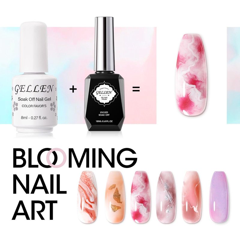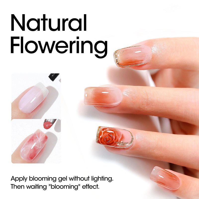 - 【Easy To Use】1、Nail prep and apply base coat and cure 60s, 2、Apply the clear blooming gel polish and DO NOT CURE, 3、Apply the color gel, and use nail art brush to paint with color gel you like, and cure 60s with UV/LED Lamp, 4、Apply top coat and cure 60s