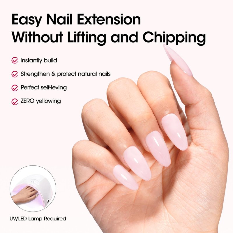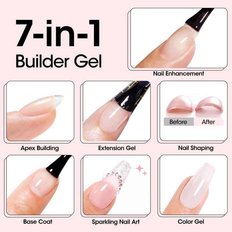 - Builder Nail Gel: Our gel nail builder adopts an innovative formula, making it effortless to apply, smooth to glide, and self-leveling, ensuring consistently excellent results. This multi-functional gel builder is perfect for 7 purposes, including as a base coat, color gel, building apex, strengthening overlay, extending length, shaping nail, and sealing nail art!