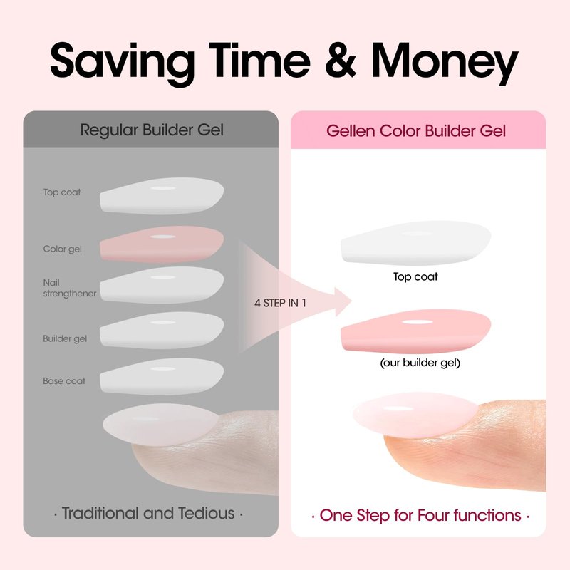 - Quick and Easy Application: Brush , level, and cure. High self-leveling formula along with built-in brush makes it easy to spread, help you create length, thickness or add strength to the nail you want, and ensure strong, durable nails with a natural finish. Create classy manicures with Gellen builder gel!(Need to be cured under UV/LED lamp for 60-90s)