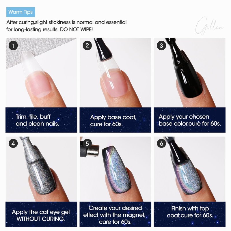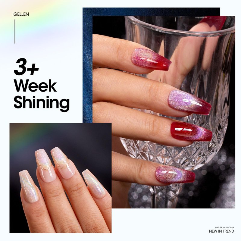 - 【21+ Days Long-lasting Rainbow Shining Effects, Reaching Eye-catching Result】: Our holographic nail polish kit is long lasting for 21+ days, keeping the shinny effect in your daily life. Reflective cat eye gel nail polish can reflect glitter under the light to form a very marvelous effect. It's time to create infinite looks with Gellen cateye gel!