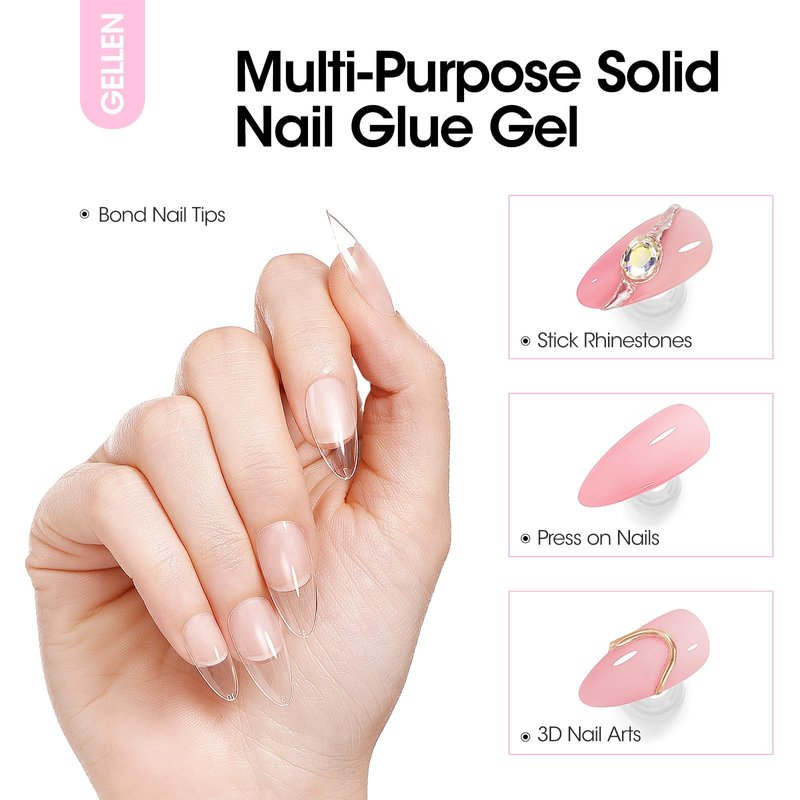 - 【Multi-Use Solid Gel Nail Glue】: Solid texture for strong adhesion. Multi-functional gel nail glue for nail tips, acrylic nails, press on nails,fake nails,or soft gel nails, rhinestones, and 3D nail designs. The glue gel is non-sticky, non-flowing, flexible, repositionable and no hand to press for curing, perfect for nail beginners and pros.