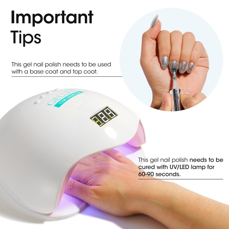 - 【Warm Reminder】The gel nail polish needs to be cured under UV LED light.Base and Top coat required.Average for LED light 60-120 secs.