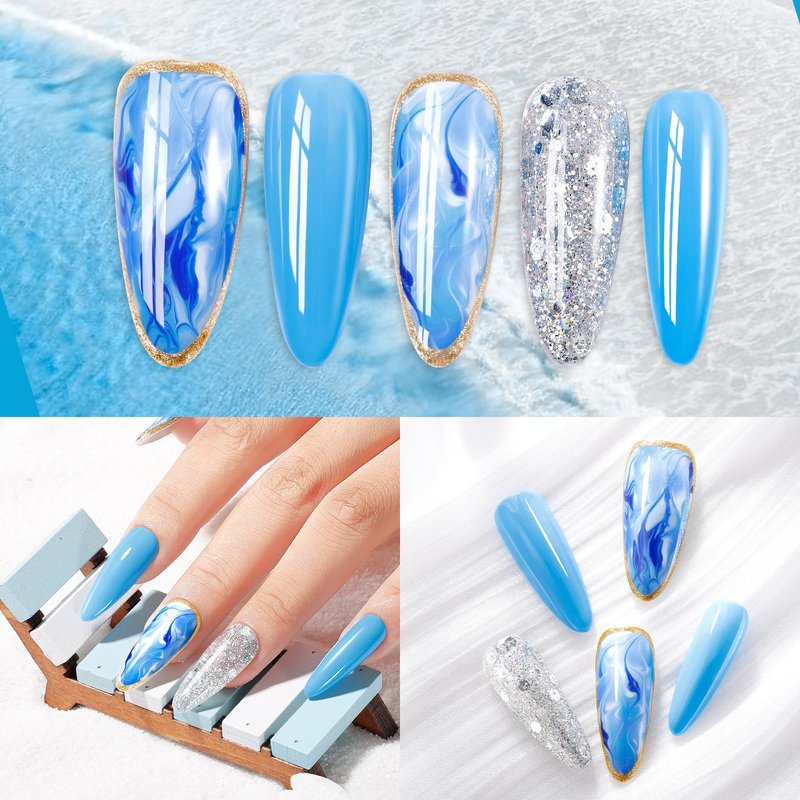 - 【Blue Gel Nail Polish Set】 6pcs x 6ml/0.21oz summer ocean deep blue gel nail polish set. We put the most popular blue and white colors together, and refer to the natural colors of sea, this is a stylish, modern manicure nail polish set. It comes with 4 blue gel nail polishes, 1 white gel nail polish and 1 glitter gel nail polish to DIY at home for summer or 4th of july gel polish kit.