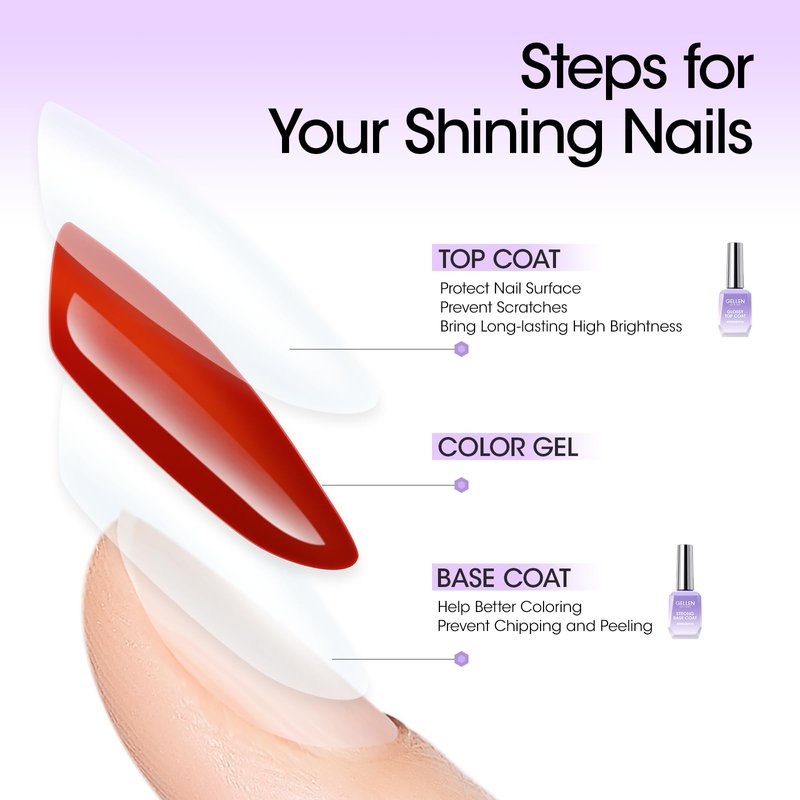 - 【Superior Gel Top & Base Coat】: You will get 1*18ml Strong Gel Base Coat and 1*18ml Glossy Gel Top Coat. Gellen Strong Base Coat Nail Polish with very smooth texture can provide super adhesion to color gel polish and natural nails. Gellen Glossy Top Coat Nail Polish that dries faster and is harder than others can provide a brilliant mirror-like shine and high-gloss wear, while also providing a protective barrier against nail abrasion.
