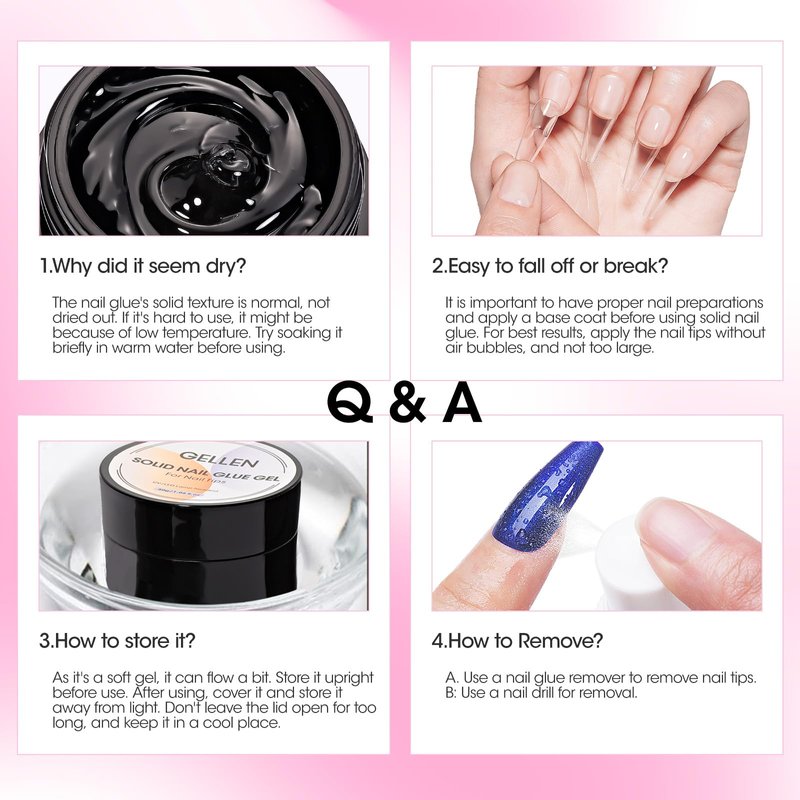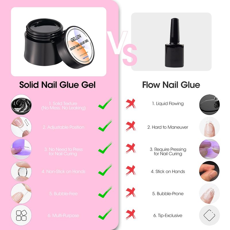 - 【Multi-Use Solid Gel Nail Glue】: Solid texture for strong adhesion. Multi-functional gel nail glue for nail tips, acrylic nails, press on nails,fake nails,or soft gel nails, rhinestones, and 3D nail designs. The glue gel is non-sticky, non-flowing, flexible, repositionable and no hand to press for curing, perfect for nail beginners and pros.