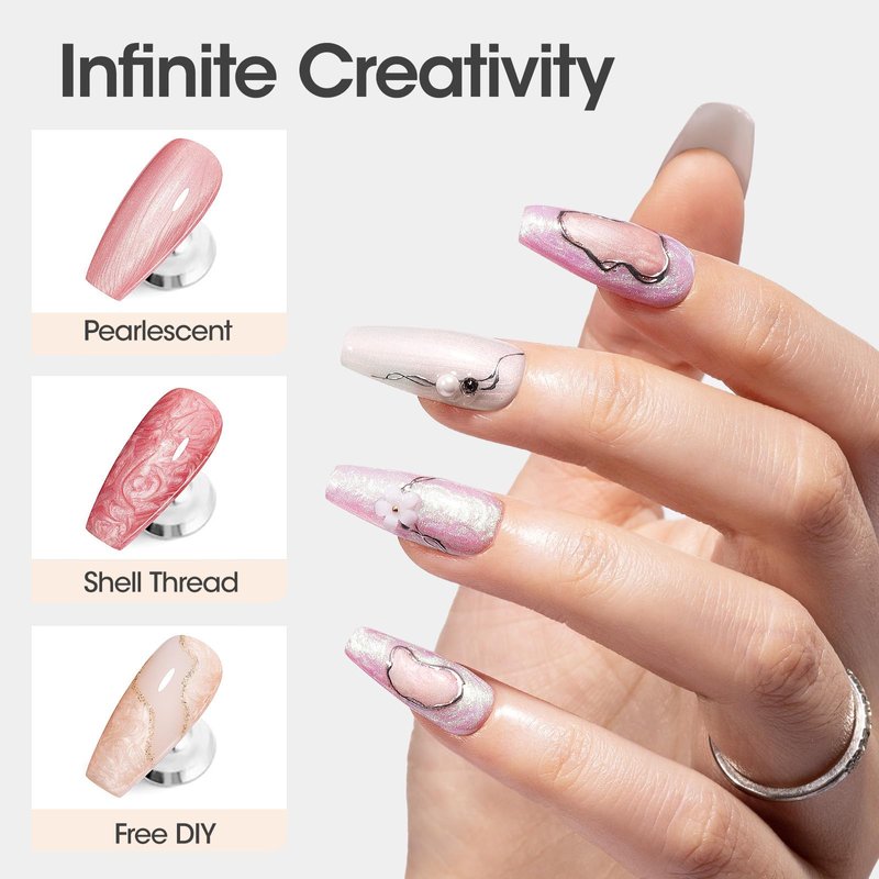 - 【Pearl Gel Nail Polish】: Pearl Effect Nail Polish features a beautiful micro-shimmer effect that glistens in the sunlight. 2-in-1 shimmer gel polish, 10ML/ 0.33fl oz, not only can be pearl gel polish but also can be thread Shell nail gel. A selection of 6 popular colors, nude skin tones to elegant pastel shades for all year round