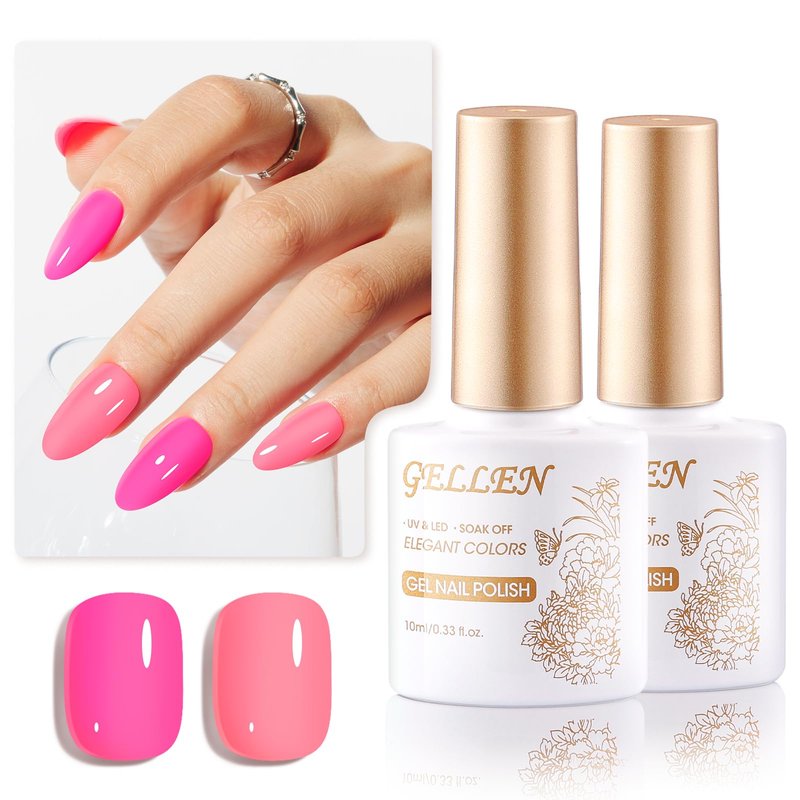 - 【Pink Gel Nail Polish Kit】: This Gellen classic starter nail polish set includes 1*10ml water pink gel polish + 1*10ml light pink color gel polish. Pink nail gel is a captivating, beautiful, and magical gel polish.