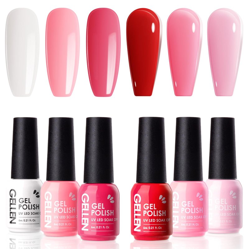 Gellen Red Gel Polish Set, 6 Colors Red Rose Pink Jelly Gel Nail Polish Set, French Tip Gel Polish Set Soak off U/V Light Cured Nail Art Valentines Gifts for Her