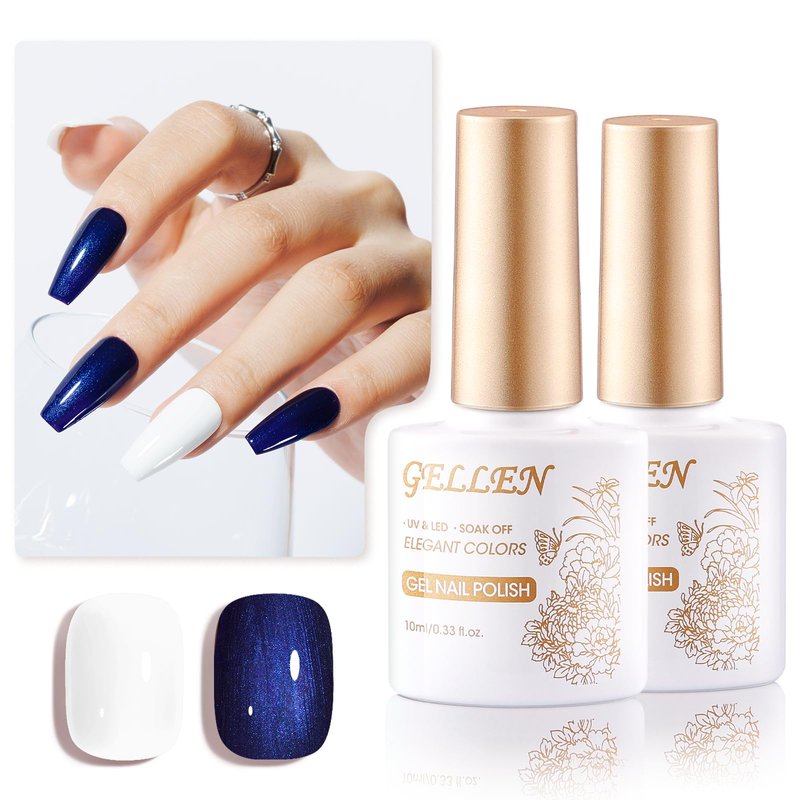Gellen White Blue Gel Nail Polish Set, Summer White Gel Polish & Shimmer Blue Gel Polish, Soak off No Wipe UV Gel for Nail Art Manicure DIY at Home Women Girls Gifts, 10ml