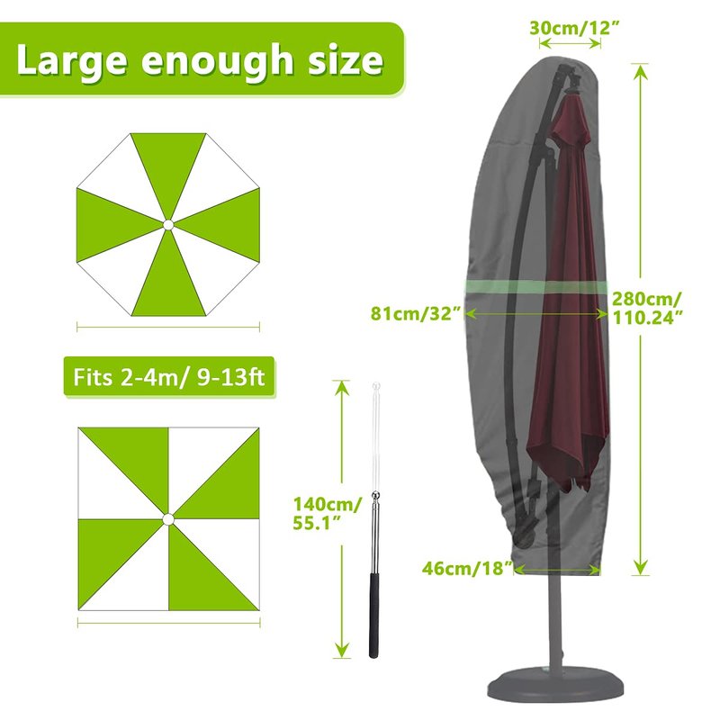 - ☀IDEAL SIZE — Outdoor umbrella cover is suitable for a comprehensive range of patio offset umbrella. It fits outdoor offset umbrellas 9-13 feet in diameter.