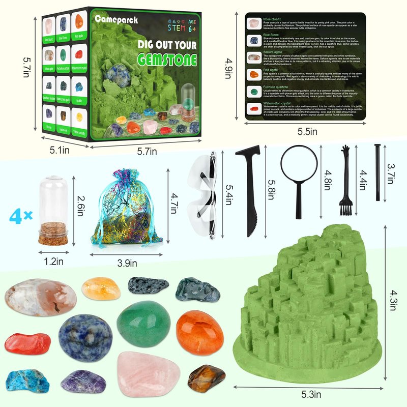 - šćEasy to Dig Up 12 GemstonesćChildren can experience the joy of real archaeological excavation and exploration by digging up 12 different gemstones.It's great for developing curiosity, practical skills, and knowledge of geology.Unlike other kids toys, the Gemstone Dig Kit seamlessly blends educational value with fun! Don't you want your kids to experience that?