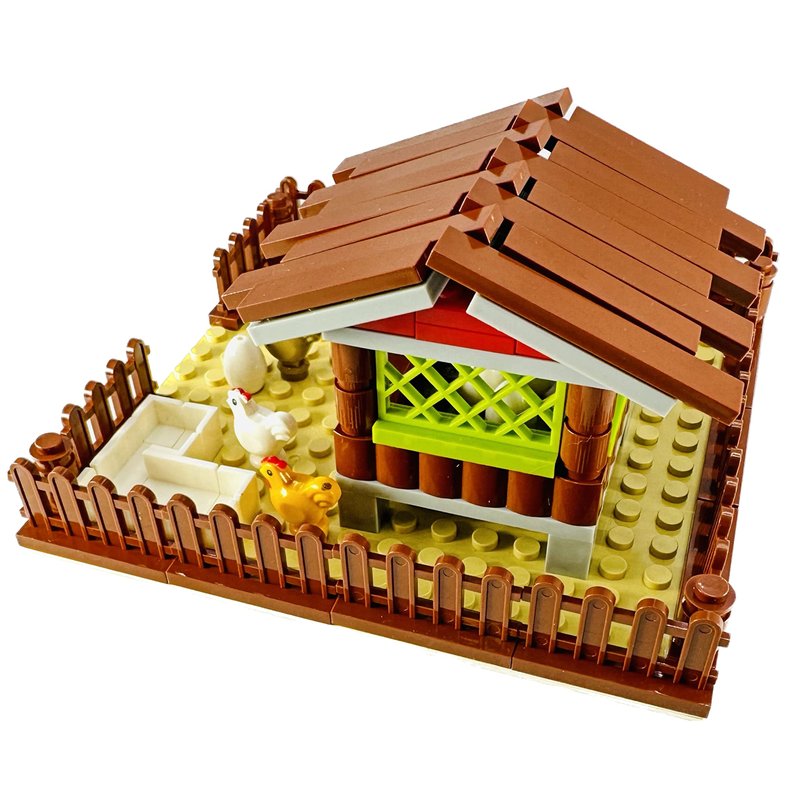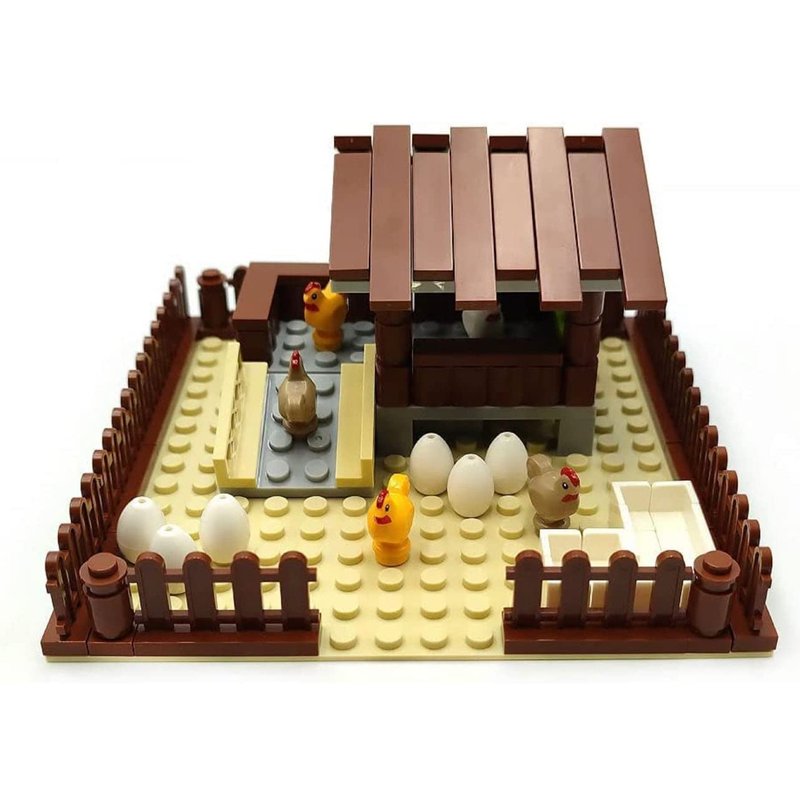- It contains 6 hens, 6 eggs, 13 pieces of fencing, and a baseplate as well as pieces to build your own coop and feeding trough. This coop is fun and creative to build and can be added to other rural sets like our barnyard set or our country garden set. If you have a city streets group branch out into a rural country scene or have city chicken in your back yard. The finished build measurements are 4.8 in x 4.8 in x 2.56 in.