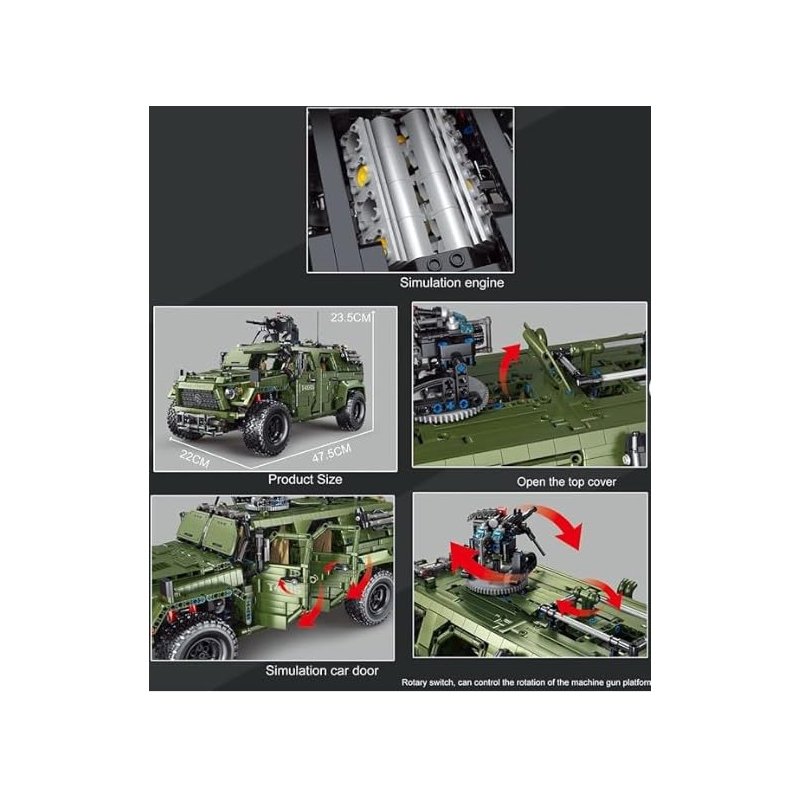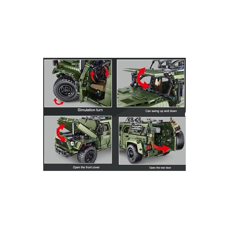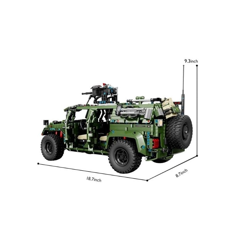 General Jim's Warrior Off Road Vehicle is a modular building block vehicle with 3175 quality pieces. Pieces are compatible with other major brand building block bricks. This is a 1:8 size model. The Warrior is a military vehicle with plenty of details to keep you exploring. Open the hood and you will find a detailed engine, there is a wench on the front and tires turn with the steering wheel. The outside is made to look armor plated. Window armor can be opened and closed over the windshield. All 4 side doors open to see details inside. Back door opens to see inside and comes complete with spare tire and spare gas can. The machine gun on the roof is on a turret that can be rotated. With so many details you imagination can take over for play or it can be displayed as a model. Finished product measures 18.7 in x 8.66 in x 9.25 in tall. 100% Satisfaction Guaranteed! No Builder Left Behind Guarantee: Have a problem with your order or need replacement parts? Please contact us through buyer/seller messaging. We strive for the best customer service and will take care of any problems ASAP! Product comes in original packaging with detailed printed paper instructions.