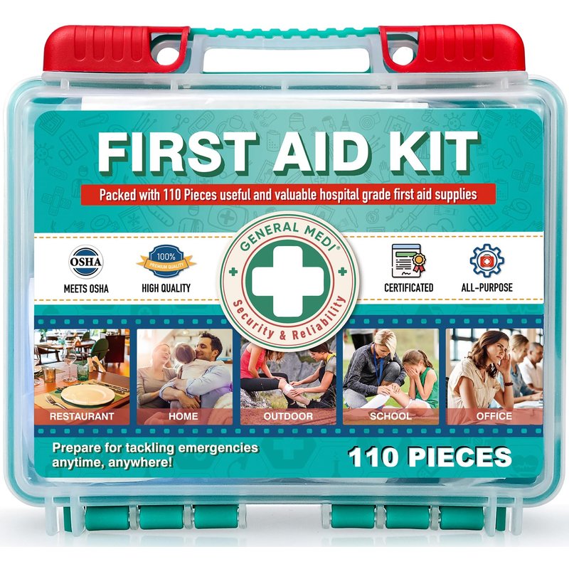 General Medi 110 Pieces Small First Aid Kit - HardCase First Aid Box - Contains Premium Medical Supplies for Travel, Home, Office, Vehicle, Camping, Workplace & Outdoor