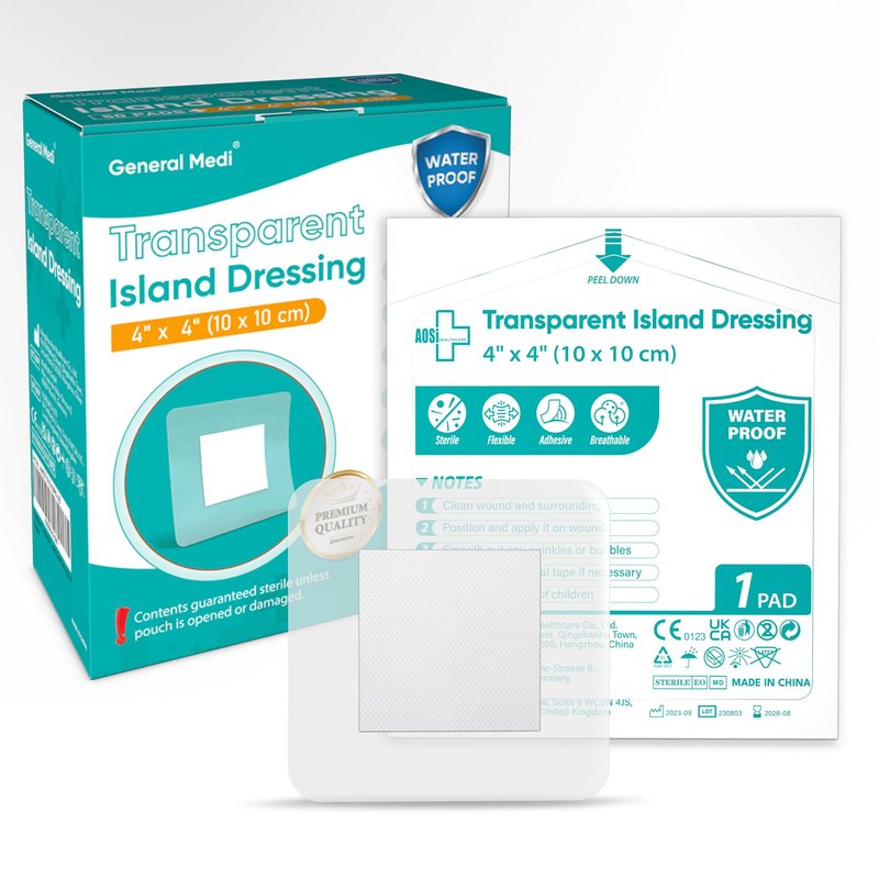 General Medi Waterproof Transparent Adhesive Island Dressing (50 Count, 4" x 4"), Wound Care Pad with Adhesive Border - Sterile, Soft & Highly Absorbent Medical Grade Dressing Pad