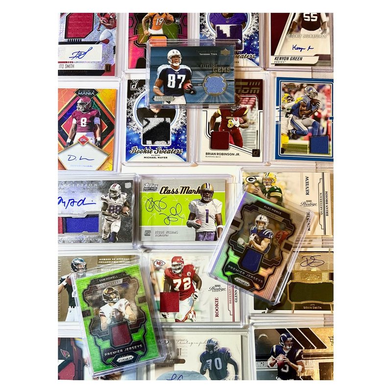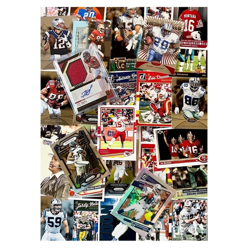 100 Football Card Mystery Box With 1 HIT Autograph or Jersey or Relic RC HOF >Every pack will contain 1 Autograph, Jersey, or Relic cards per box. These cards will come in a protective sleeve and top loader to ensure they arrive in high grade. The rest of the 100 cards will come from Premium, Base, Parallel, Subsets, Inserts, & #-ed cards and will contain Hall of Fame players, Stars, Rookie, &and/or Pre-Rookies in every lot >No Duplicates! (Also no checklists- unless they have pictures/players on the front- because checklist cards feel like a rip off in mystery boxes) {Also, also- each lot is capped at no more than 25 cards from any one particular set (normally no more than 10-20), because there is nothing worse than a mystery box with 50 cards from one type} >Cards will be from all makers and eras mostly from the 1980s to now, from the newest collections we have purchased. No cards are pulled from collections- all make it into the boxes >Cards will be from all Major Leagues, Minor Leagues, Colleges. and all other Leagues. >Cards will all be in Excellent to NM. (most will be EX/NM- or better - pack fresh condition) >Cards will ship bubble wrapped for protection in a plain 250 card box, because collectors always need more card space. >Card Box will be in waterproof poly mailer to protect our cardboard goodies from the weather. >>> Stock photos are representative of the cards you might receive in your lot