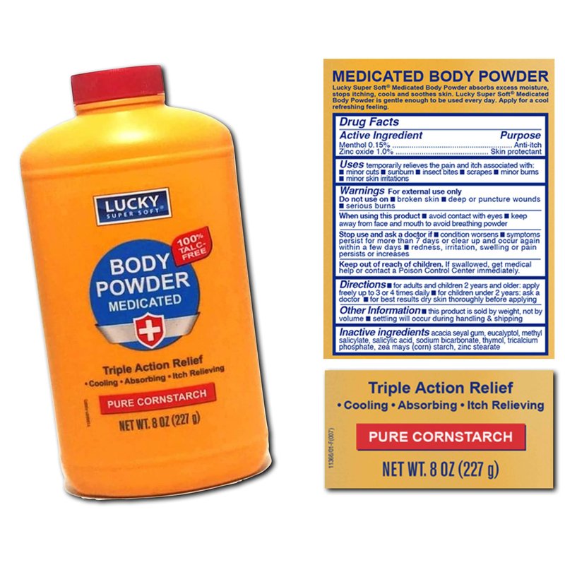 2 pc Body Powder Medicated 8 oz Cooling Itch Triple Action Relief 100 Percent Talc-Free Set of 2 Medicated Body Powder bottles, 8 oz each (227g). Lucky Super Soft absorbs excess moisture. Stops itching, cools and soothes skin. Gentle enough to be used every day. Apply for a cool refreshing feeling. Active ingredients: Menthol 0.15 Percent Purpose: Anti-itch Zinc oxide 1.0 Percent . Purpose: Skin protectant Cornstarch Powered with Zin Oxide and Menthol With cornstarch and zinc oxide, get a protective barrier to repel moisture and help keep skin dry. This gentle powder is recognized as safe and effective by moms and doctors in treating diaper rash, prickly heat, and chafing. Odor neutralizing ingredients to absorb sweat and moisture. Use this Triple Action Body Powder wherever you need a little freshness, comfort, and moisture control. Sweaty and itchy skin needs strong relief. Best of all, this extra-strength cooling and itch relieving powder is gentle enough to use daily when used as directed.