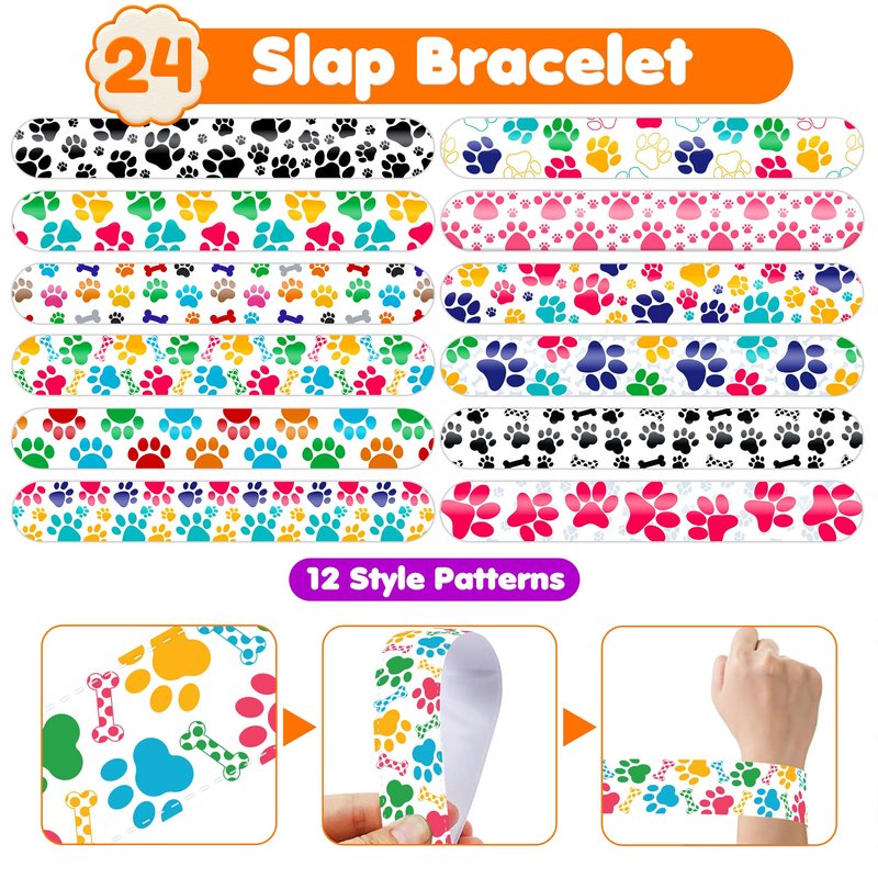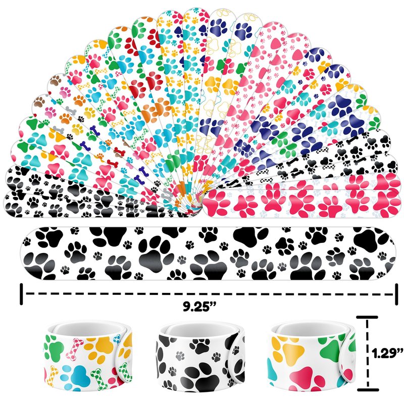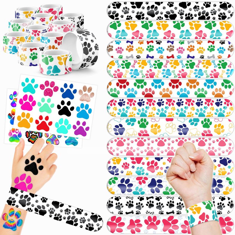 - 🐾【PAW PRINT PARTY FAVORS DELIGHTFUL BUNDLE】: Prepare for giggles with our set of 24 slap bracelets and 24 temporary tattoo stickers. Each piece features a lively and adorable design inspired by the Paw Print, dogs, puppy,.. theme. Perfect for kids and adults alike, this bundle promises boundless enjoyment. The bracelets measure 23.5cm x 3.3cm, providing a gratifying "slapping" experience as they effortlessly encircle your wrist.