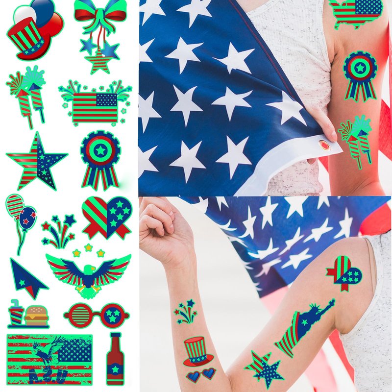 - 4th of July Glow in the Dark Patriotic Temporary Tattoos: Our Independence Day tattoo stickers are exquisite and cute, full of classic elements of the patriotic holiday, such as the American flag, the Lady of Independence, stars, fireworks, hats, sunglasses, balloons, etc., with bright colors that make you You feel the festive atmosphere.