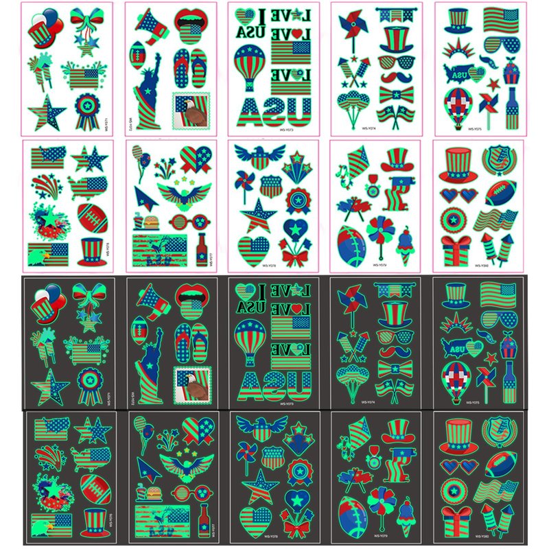- Independence Day Temporary Tattoos : Luminous Temporary Tattoos will need a few minutes of activation by light before they will glow in the dark. With these temporary tattoos glowing, your kids will get a lot of fun in the dark night. After absorbing sunlight during the day, this tattoo will glow in the dark. The luminous time will be affected by light and temperature.