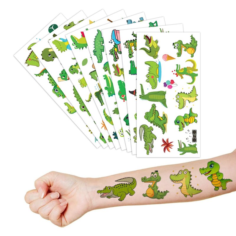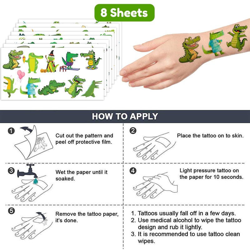 - đăIDEAL TATTOOS FOR THEMED ALLIGATOR DECORă: This set of temporary Alligator-themed tattoo stickers comprises 8 sheets in total, featuring a total of 96PCS striking, distinct designs. They are excellent for distributing as party favors and small gifts with an Alligator theme for holidays. Each sheet measures 6.1 * 3.1 inches, making them suitable for boys and girls of all sizes.