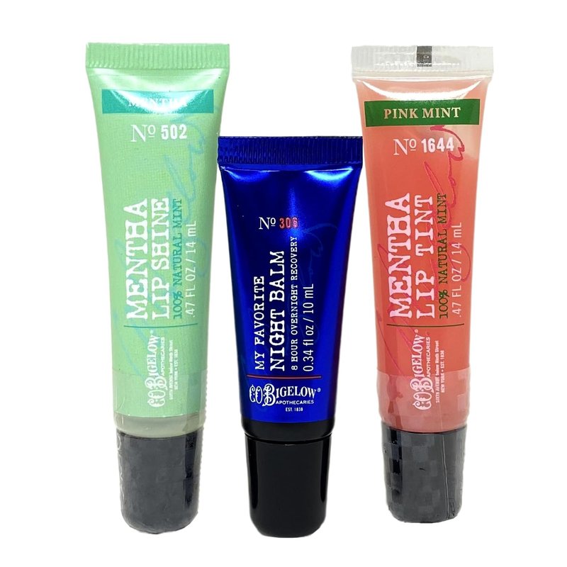 - INCLUDES: .34 fl oz / 10 mL My Favorite Night Balm, .47 fl oz / 14 mL Pink Mint Mentha Lip Tint, and a .47 fl oz / 14 mL Original Mentha Lip Shine.
