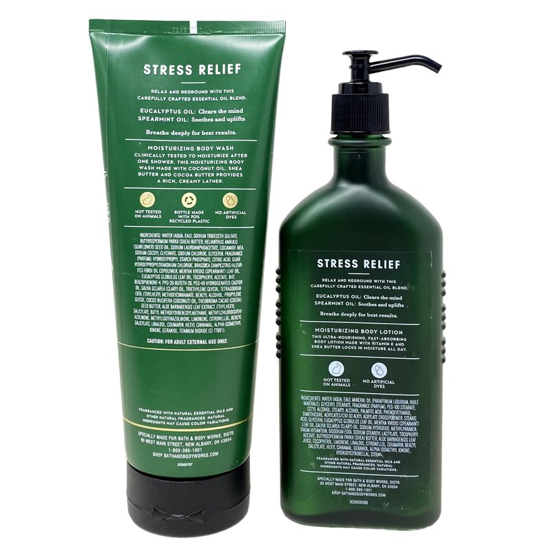 Bath and Body Work Aromatherapy Stress Relief EUCALYPTUS + SPEARMINT 2 Piece Set. INCLUDES: 10 fl oz / 296 mL Moisturizing Body Wash and 6.5 fl oz / 192 mL Moisturizing Body Lotion. What it smells like: a day at the spa with your fresh, herbal favorites. Fragrance notes: eucalyptus oil (clears the mind) and spearmint oil (soothes and uplifts).