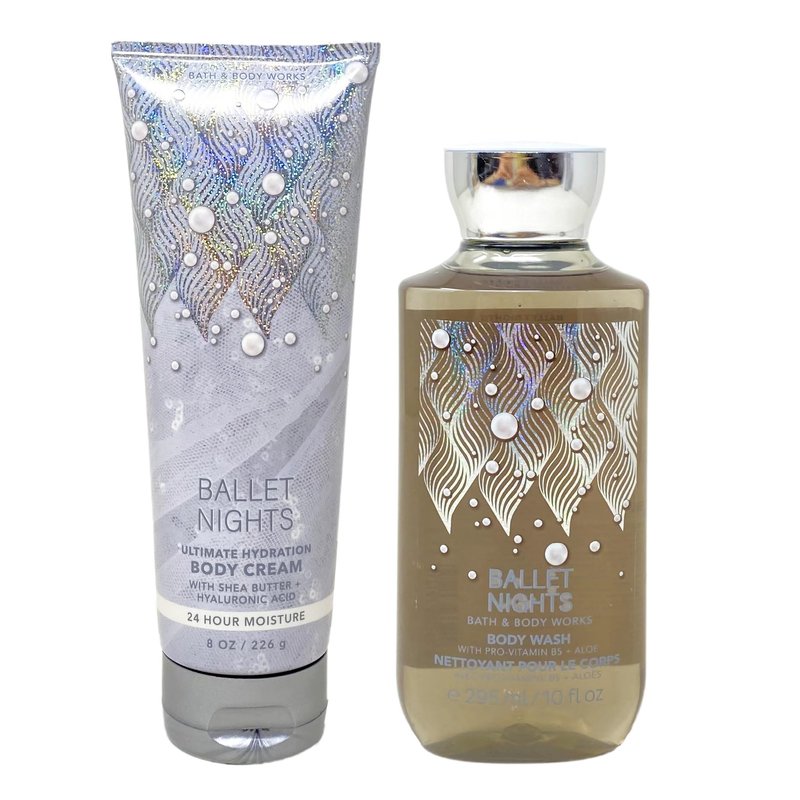 Bath and Body Work BALLET NIGHTS Gift Set . INCLUDES: 8 oz / 226 g Ultimate Hydration Body Cream and a 10 fl oz / 295 mL Body Wash. Fragrance Notes: Wild Plum, Glowing Amber, Tonka Cream. Dance into the evening as the grand velvet curtains raise and satin slippers glide across the floor.