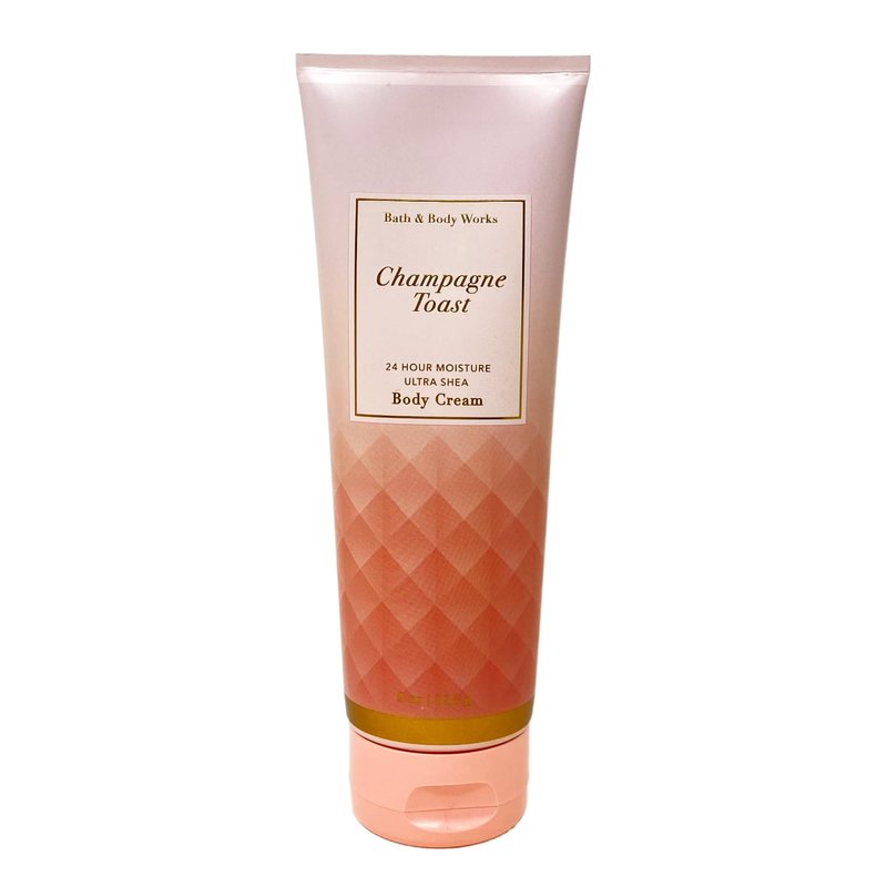 Bath and Body Work CHAMPAGNE TOAST Bundle. INCLUDES: 8 oz / 226 g Ultra Shea Body Cream and a 10 fl oz / 295 mL Aloe + Vitamin E Shower Gel. What it smells like: a fruity, sweet, sparkling spritzer. Fragrance notes: bubbly champagne, sparkling berries and juicy tangerine.