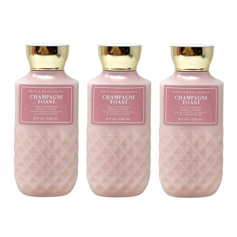 Bath and Body Work CHAMPAGNE TOAST Daily Nourishing Body Lotion Set. INCLUDES: 3 Daily Nourishing Body Lotions (8 fl oz / 236 mL each). What it smells like: a fruity, sweet, sparkling spritzer. Fragrance notes: bubbly champagne, sparkling berries and juicy tangerine. What it does: provides 24 hours of continuous moisture so your skin feels soft, nourished and conditioned.