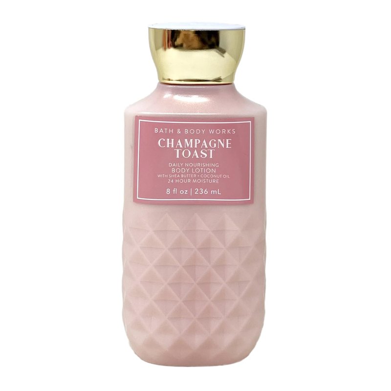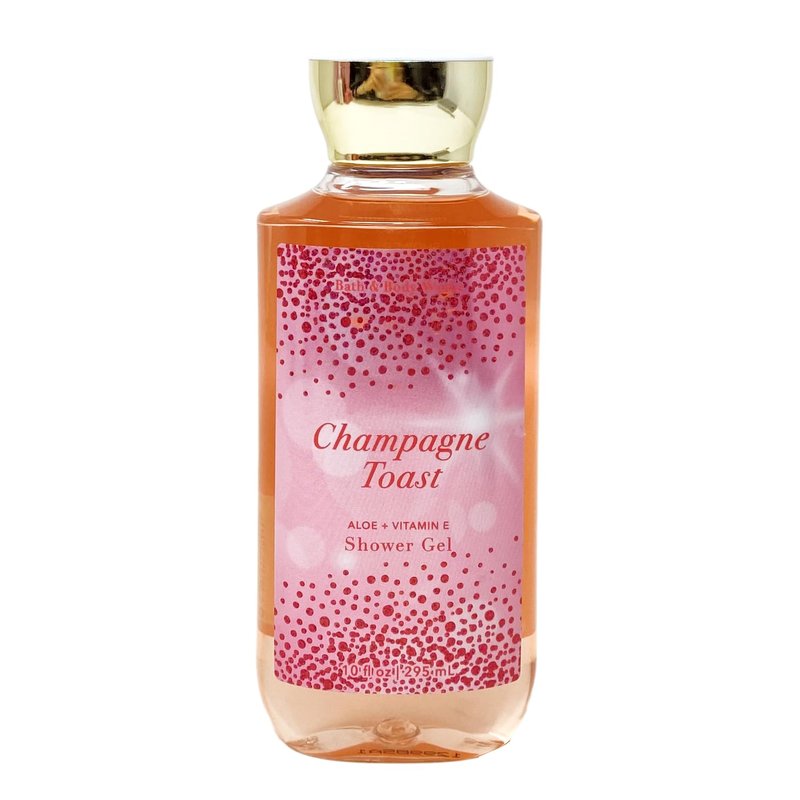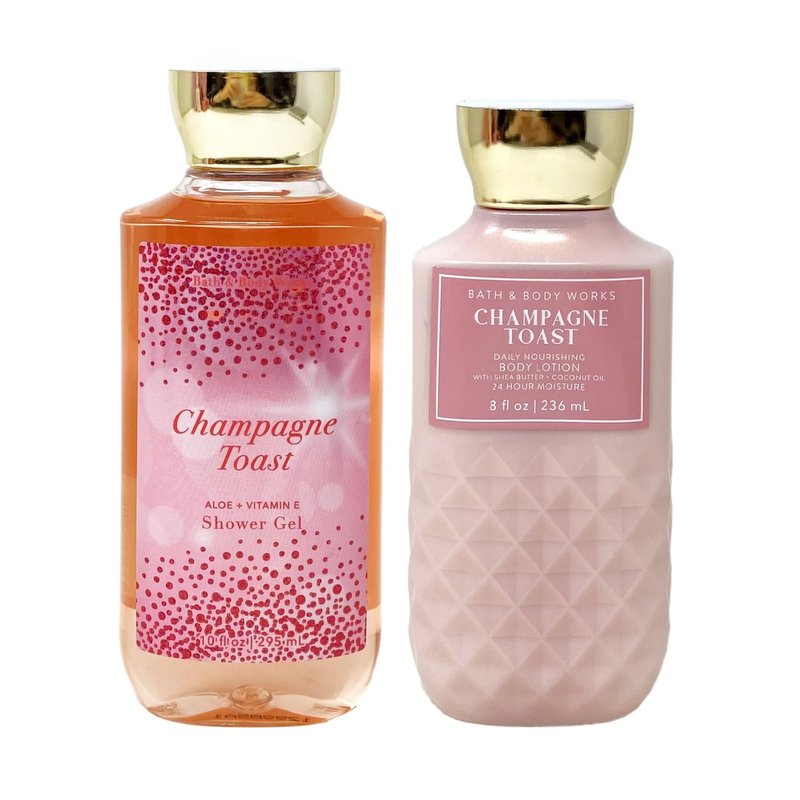 Bath and Body Work CHAMPAGNE TOAST Duo Set. INCLUDES: 10 fl oz / 295 mL Aloe + Vitamin E Shower Gel and an 8 fl oz / 236 mL Daily Nourishing Body Lotion. What it smells like: a fruity, sweet, sparkling spritzer. Fragrance notes: bubbly champagne, sparkling berries and juicy tangerine.