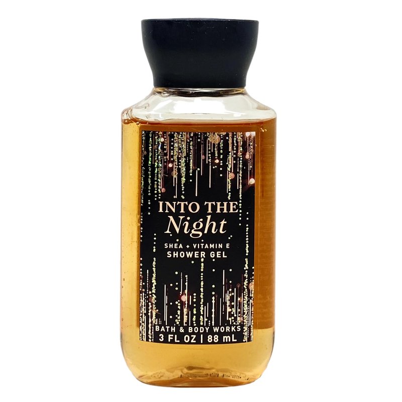 Bath and Body Work INTO THE NIGHT 2 Piece Mini Set. INCLUDES: 2.5 oz / 70 g Travel Ultimate Hydration Body Cream and 1 3 fl oz / 88 mL Travel Shea + Vitamin E Shower Gel. What it smells like: a timeless, feminine, alluring night on the town. Fragrance notes: raspberry noir, amber crystals, velvety rose petals, creamy patchouli and mocha musk.