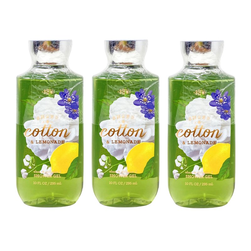 Bath and Body Work Sheer Cotton & Lemonade Shea & Vitamin E Shower Gel Bundle. INCLUDES: 3 Shea & Vitamin E Shower Gels (10 fl oz / 295 mL each). Key Notes: Crisp Cotton, Sparkling Lemonade, Wild Gardenia, Mandarin Blossom, Clean Musk. Take a stroll through charming tree-lined streets and enjoy a warm breeze on the veranda as you savor this delightful spring fragrance.