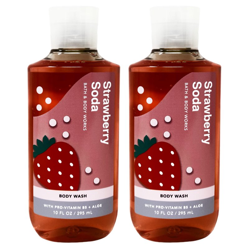 Bath and Body Work STRAWBERRY SODA Body Wash Bundle. INCLUDES: 2 Body Washes (10 fl oz / 295 mL each). What it smells like: a fruity, fizzy beverage you can't help but love. Fragrance notes: fresh strawberries, bubbly seltzer and crushed ice. What it does: gently cleanses your skin with a rich, bubbly lather.