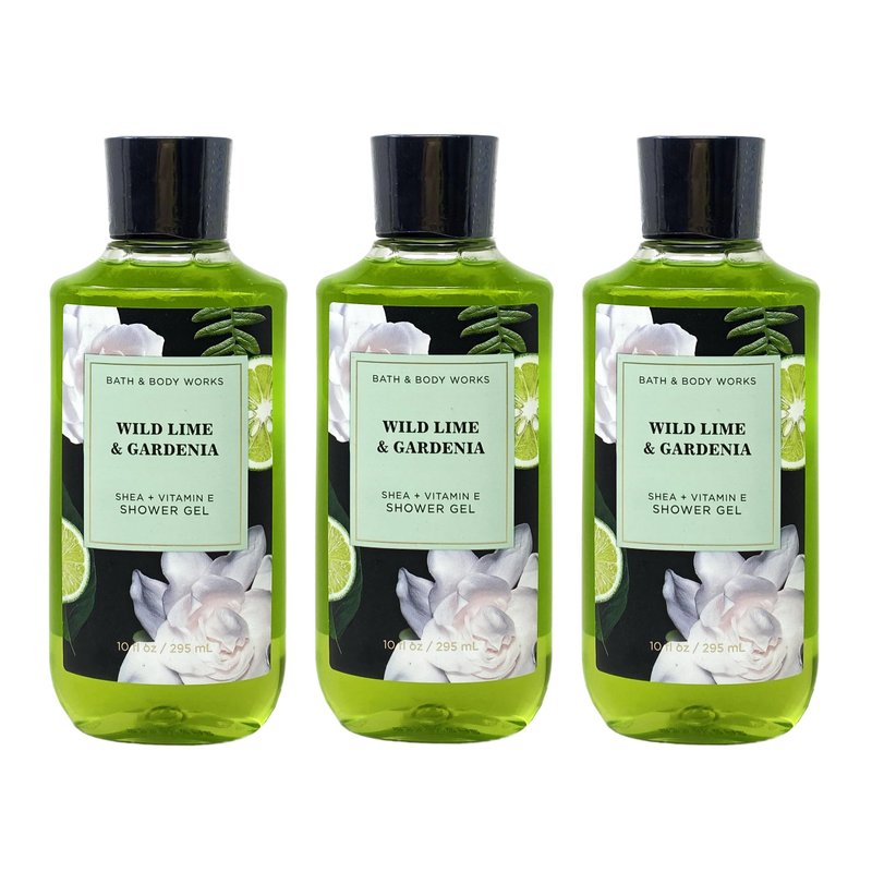 Bath and Body Work Wild Lime & Gardenia Shea + Vitamin E Shower Gel Value Pack. INCLUDES: 3 Shea + Vitamin E Shower Gels (10 fl oz / 295 mL each). Fragrance Notes: A sunny blend of bright, citrusy bergamot, fresh gardenia blooms, and warm musk. What it does: leaves your skin feeling clean and refreshed.