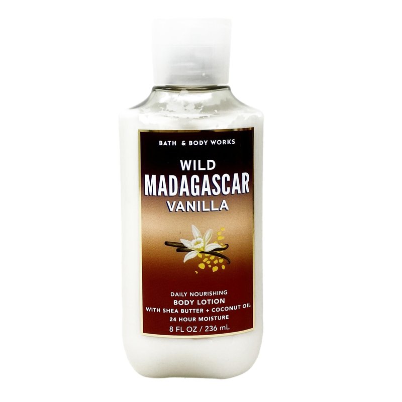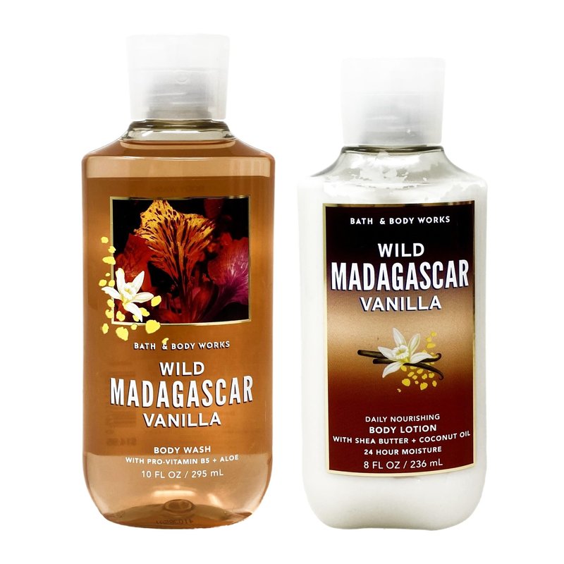 Bath and Body Work WILD MADAGASCAR VANILLA Duo Bundle. INCLUDES: 10 fl oz / 295 mL Body Wash and 8 fl oz / 236 mL Daily Nourishing Body Lotion. What it smells like: the most intriguing, exhilarating vanilla ever. Fragrance notes: wild Madagascar accord, African pear and wild jasmine.