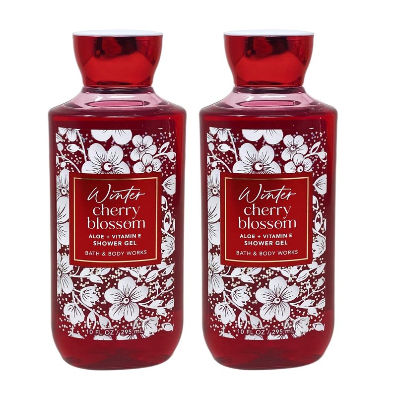 Bath and Body Work Winter Cherry Blossom Aloe + Vitamin E Shower Gel Value Pack. INCLUDES: 2 Aloe + Vitamin E Shower Gels (10 fl oz / 295 mL each). Fragrance Notes: Frosted Cherry Blossom, Ruby Berries, Silk Amber. What it does: leaves your skin feeling clean and refreshed.