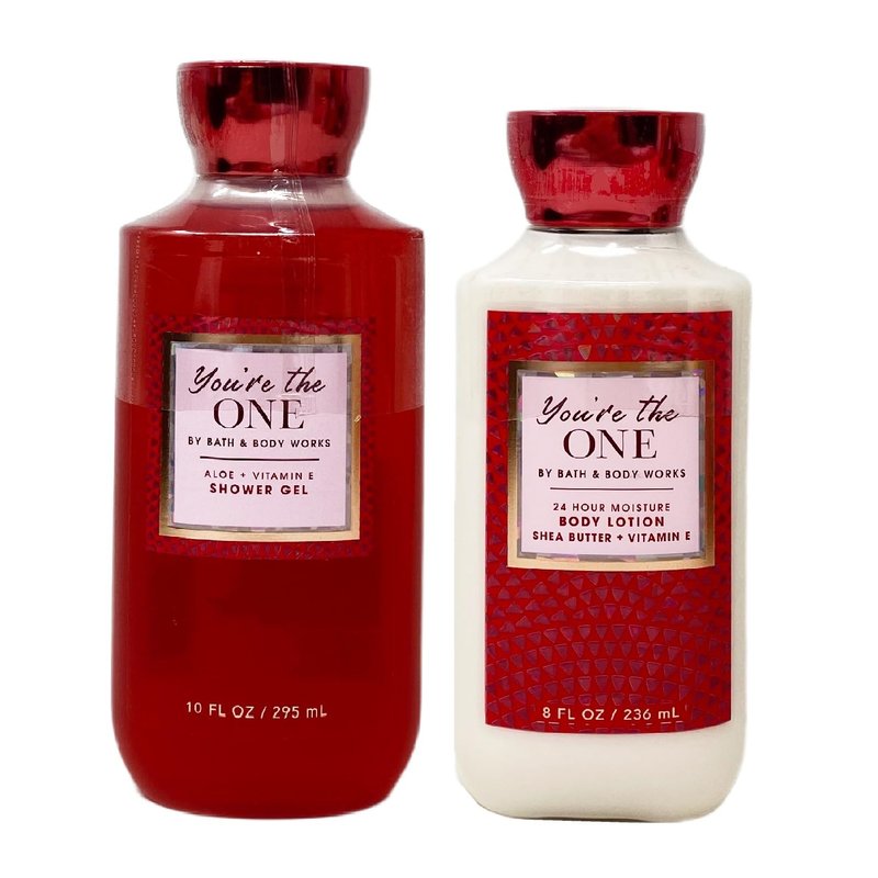Bath and Body Work YOU'RE THE ONE Duo Gift Set. INCLUDES: 10 fl oz / 295 mL Aloe + Vitamin E Shower Gel and an 8 fl oz / 236 mL 24 Hour Moisture Body Lotion. What it smells like: a sparkling, beautiful night with the one you love. Fragrance notes: white birch, velvety rose and a drop of strawberry nectar.