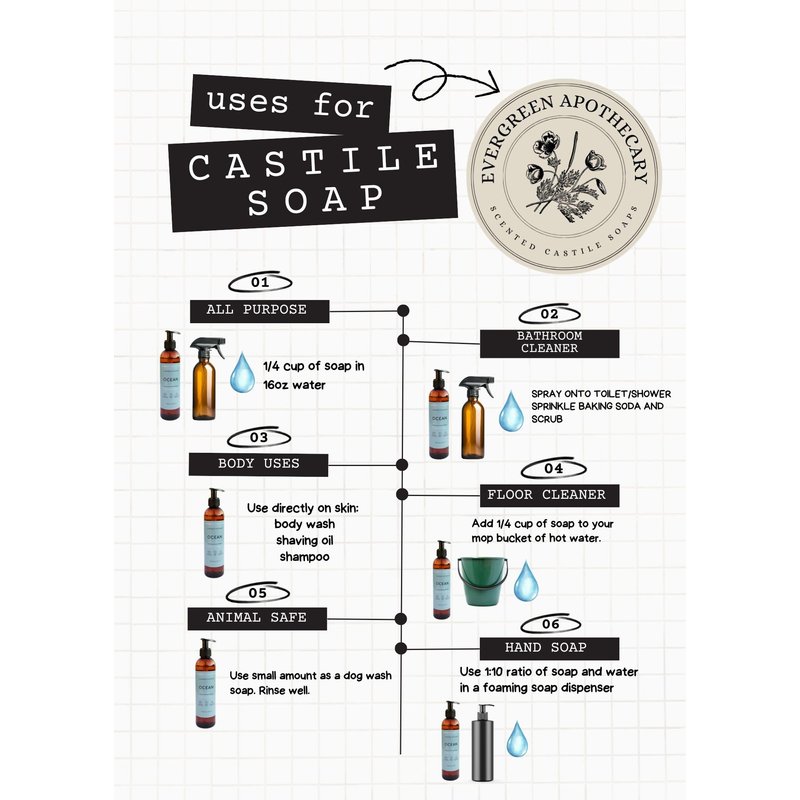 Our castile soap is a true liquid soap of Vegetable Oil origin. It is surfactant free. Made with organic coconut and high oleic sunflower oils. Free from SLS and SLES. Vegan and cruelty free compliant. You will enjoy our thick consistency versus the general water like soaps. Often times we are wary of fragrence being added to products. Our fragrence is 1% of our soap. Some of our scents are even less. Our fragrance added is Phthalate Free, Paraben Free, and SLS + SLES Free. Castile Soap has so many uses, from body wash, shampoo, all purpose cleaner, toilet bowl cleaner, dish soap, laudry detergent. Feel comfortable with a non toxic cleaner that is safe for your kids and pets.