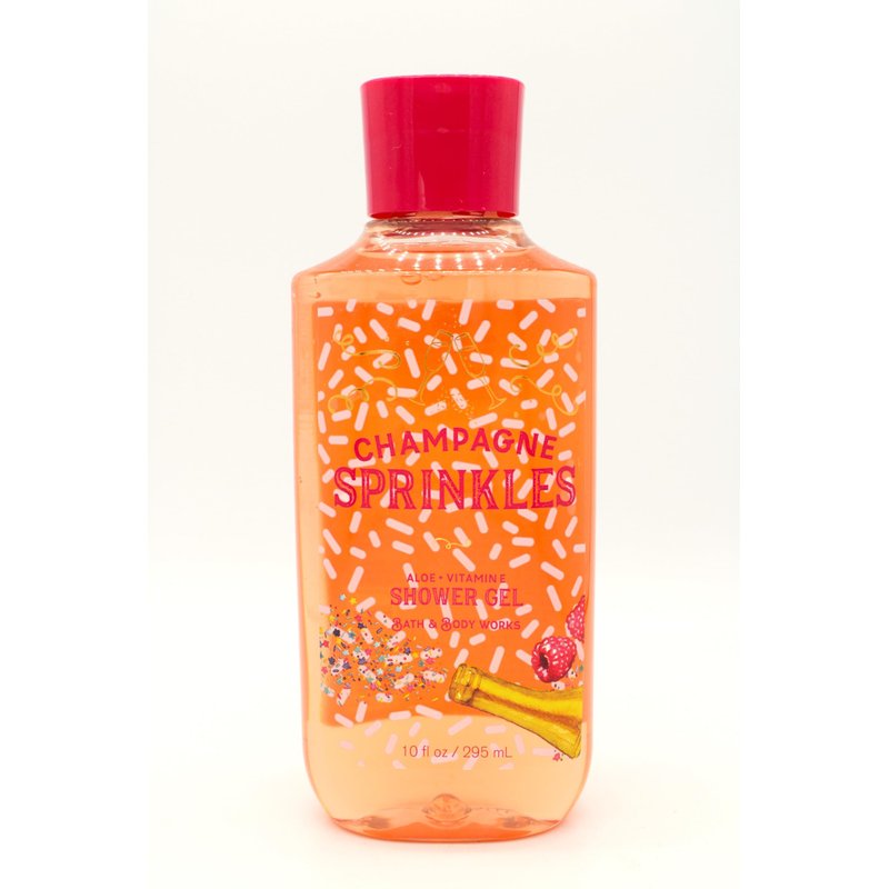 Fragrance: Champagne Sprinkles / Fragrances Notes: Sparkling Champagne, Raspberry Icing, Rainbow Sprinkles / Size: 10 fl oz (295 mL) / Made with Vitamin E and Aloe / Not Tested on Animals / Dermatologist Tested