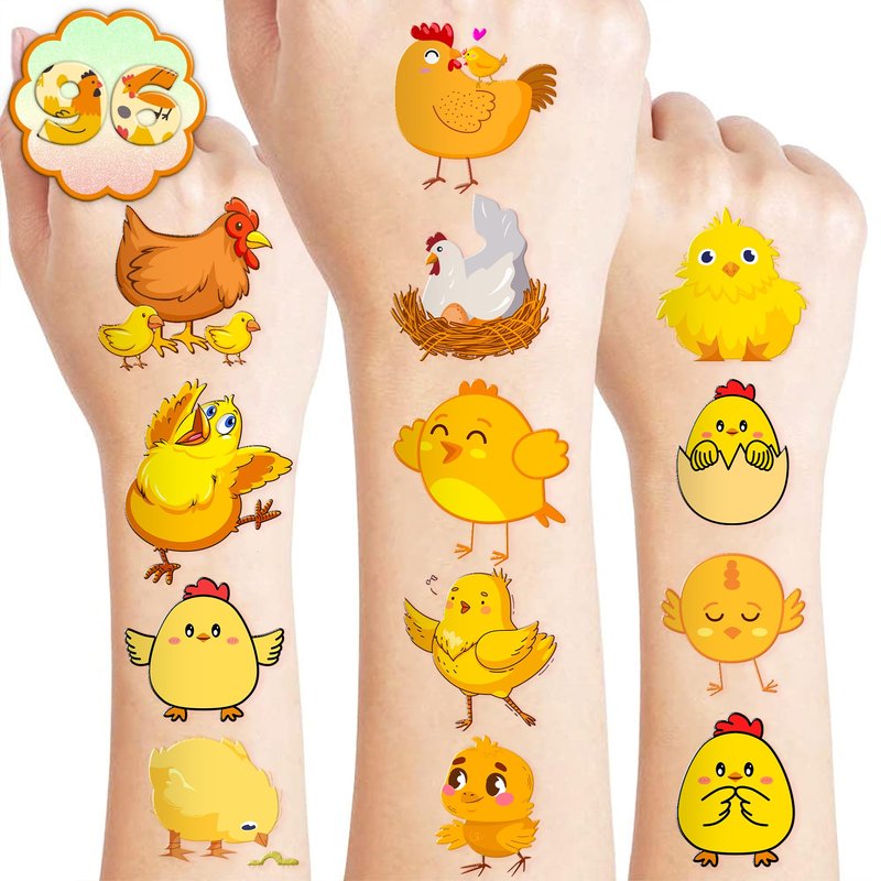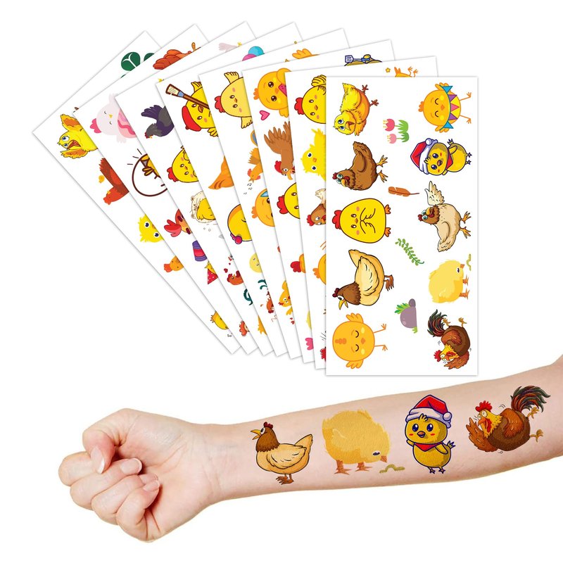 - đăIDEAL TATTOOS FOR THEMED CHICKEN DECORă: This set of temporary Chicken-themed tattoo stickers comprises 8 sheets in total, featuring a total of 96PCS striking, distinct designs. They are excellent for distributing as party favors and small gifts with a Chicken theme for holidays. Each sheet measures 6.1 * 3.1 inches, making them suitable for boys and girls of all sizes.